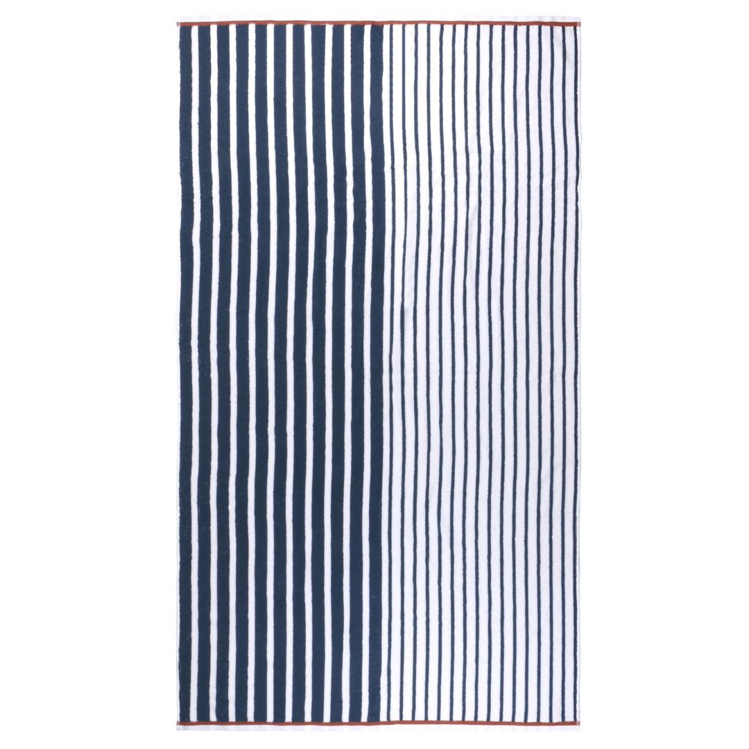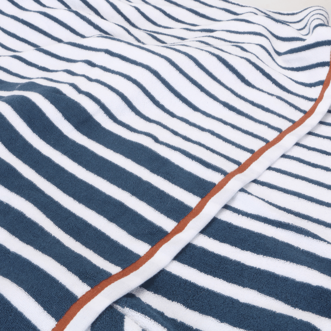 Featuring a Timeless Modern Navy Stripe Design with a pop of Terracotta colour as a feature Border. This Luxe Terry Towel is fully reversible and suitable for all ages, it's a new season must-have.