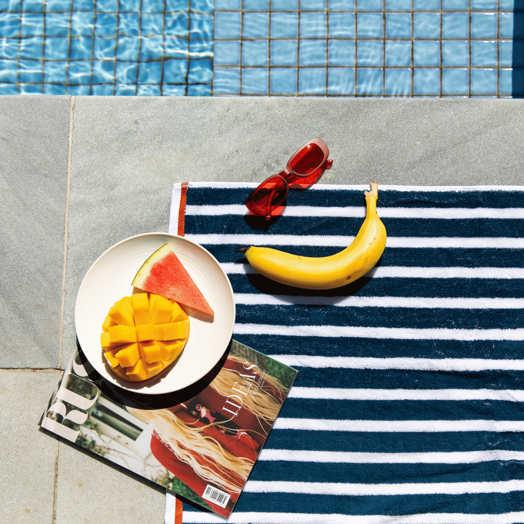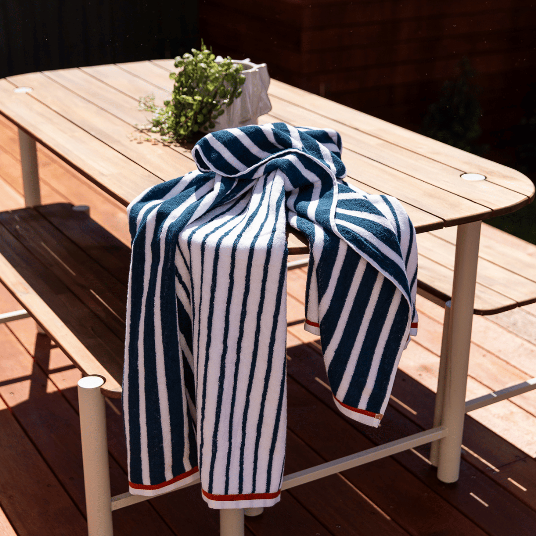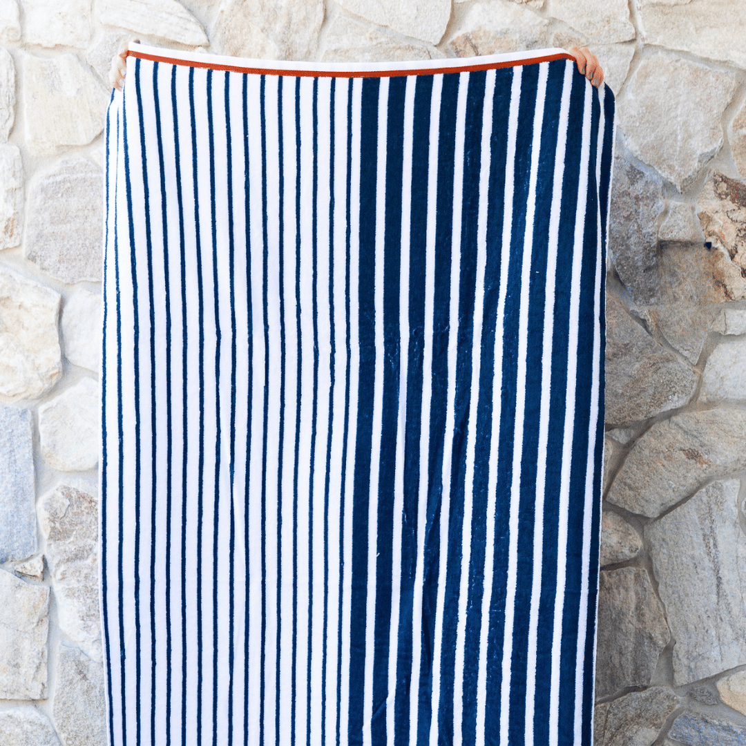 Featuring a Timeless Modern Navy Stripe Design with a pop of Terracotta colour as a feature Border. This Luxe Terry Towel is fully reversible and suitable for all ages, it's a new season must-have.