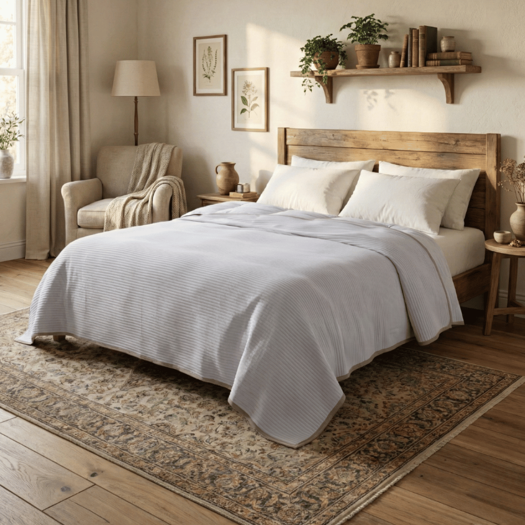 This Super Soft Jacquard Triple Layer Bamboo Cotton Jersey Blanket provides comfort and style with the ribbed texture and contrasting piping. Gorgeous styled in the bedroom or on the couch.