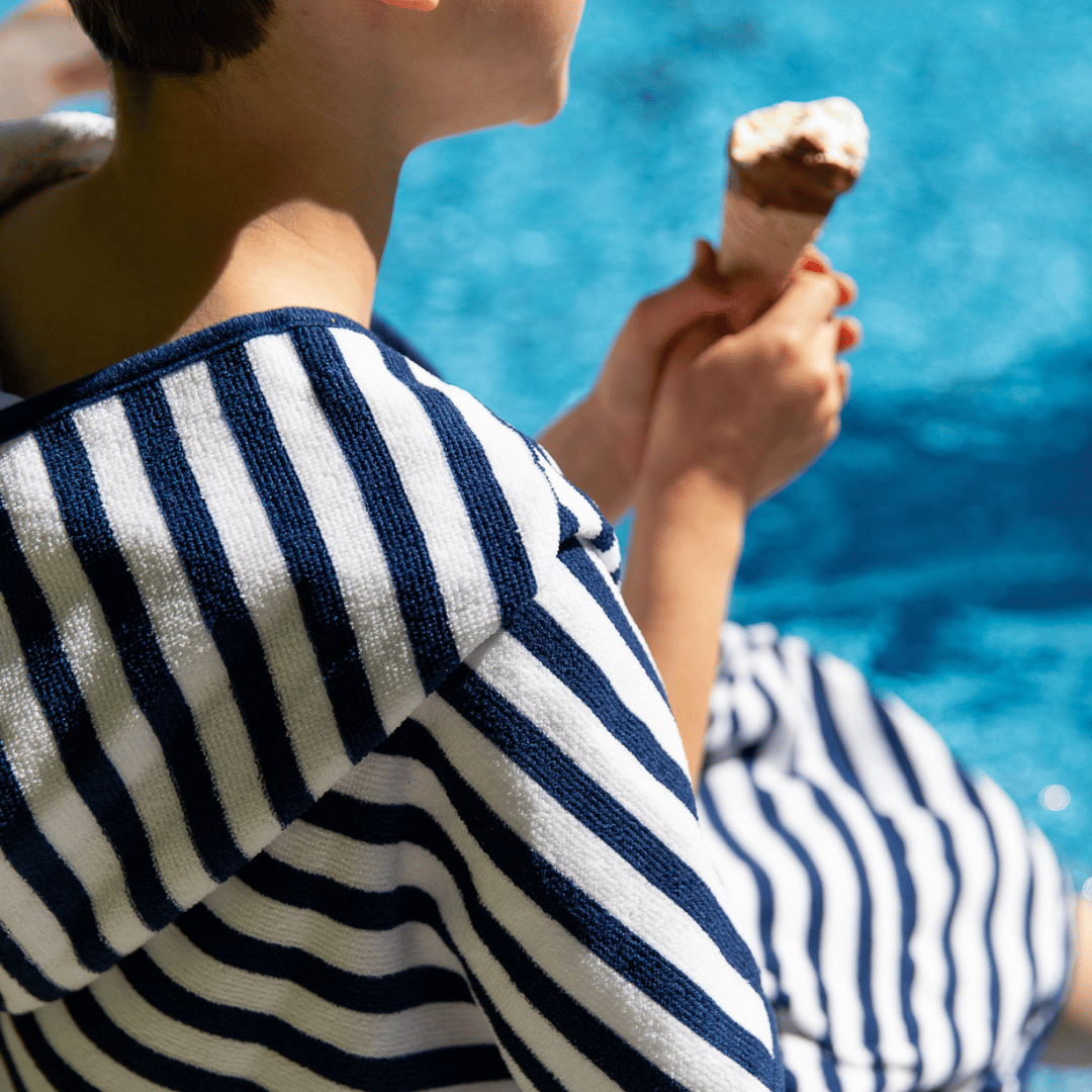 Designed with comfortable hood and front pocket for extra cosiness. Available in bright stripe colours to make them stand out on a busy beach day. Kids Hooded Poncho is also available in Red Stripe and Aqua Stripe.