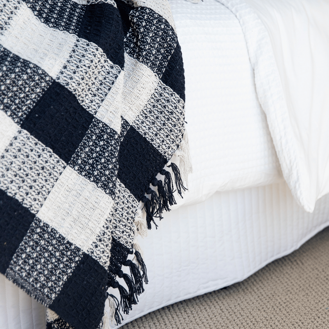 The New Cosy Spring/Summer Essential, the lovely and super soft Cotton Waffle Woven Throw. Perfect addition to the end of your bed for a light layer when the nights are cool, or a cosy companion to snuggle up on the couch. Sourced from 100% Recycle Cotton as part of our ongoing commitment to sustainable products for Australian homes. Gorgeous Cotton Waffle Throw is in a Navy and Cream Check Pattern.