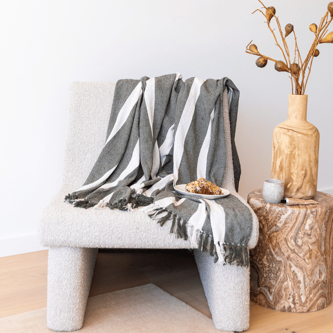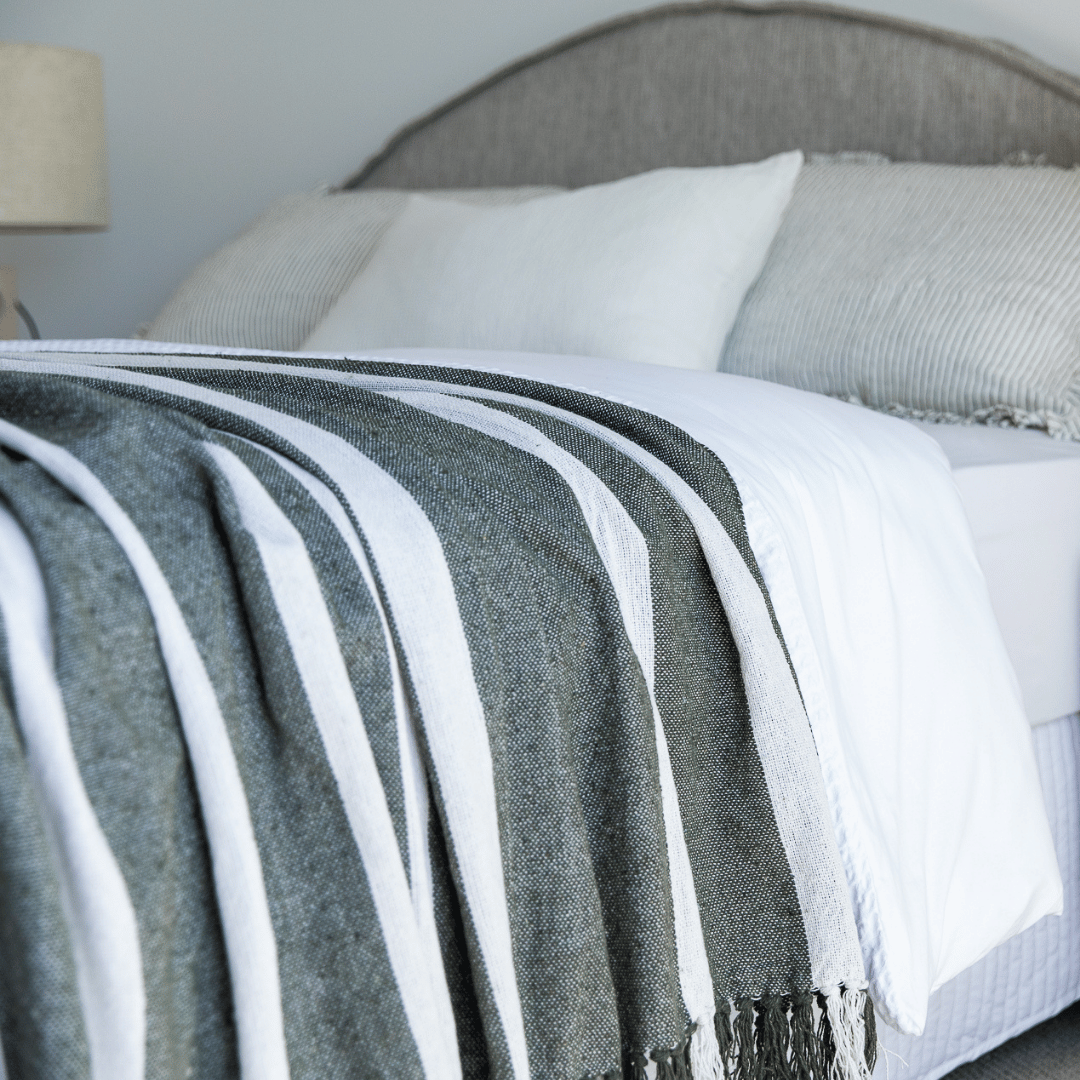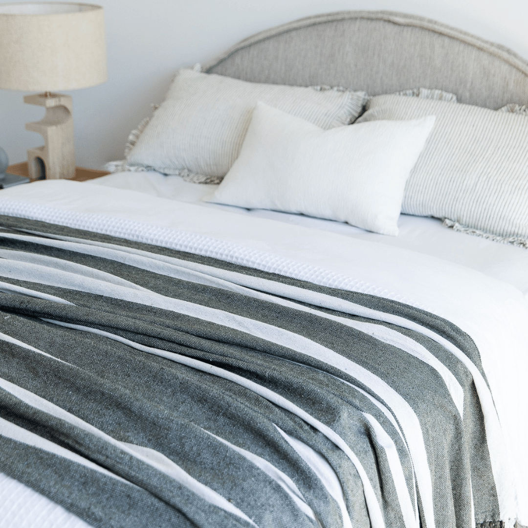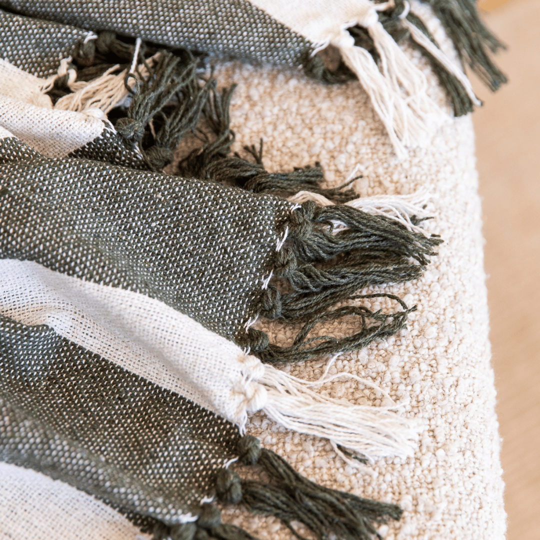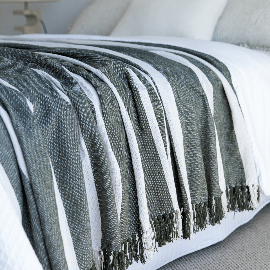 The New Cosy Spring/Summer Essential, the lovely and super soft Kirra Cotton Blanket in Moss Stripe. Perfect addition to the end of your bed for a light layer when the nights are cool, or a cosy companion on the couch.