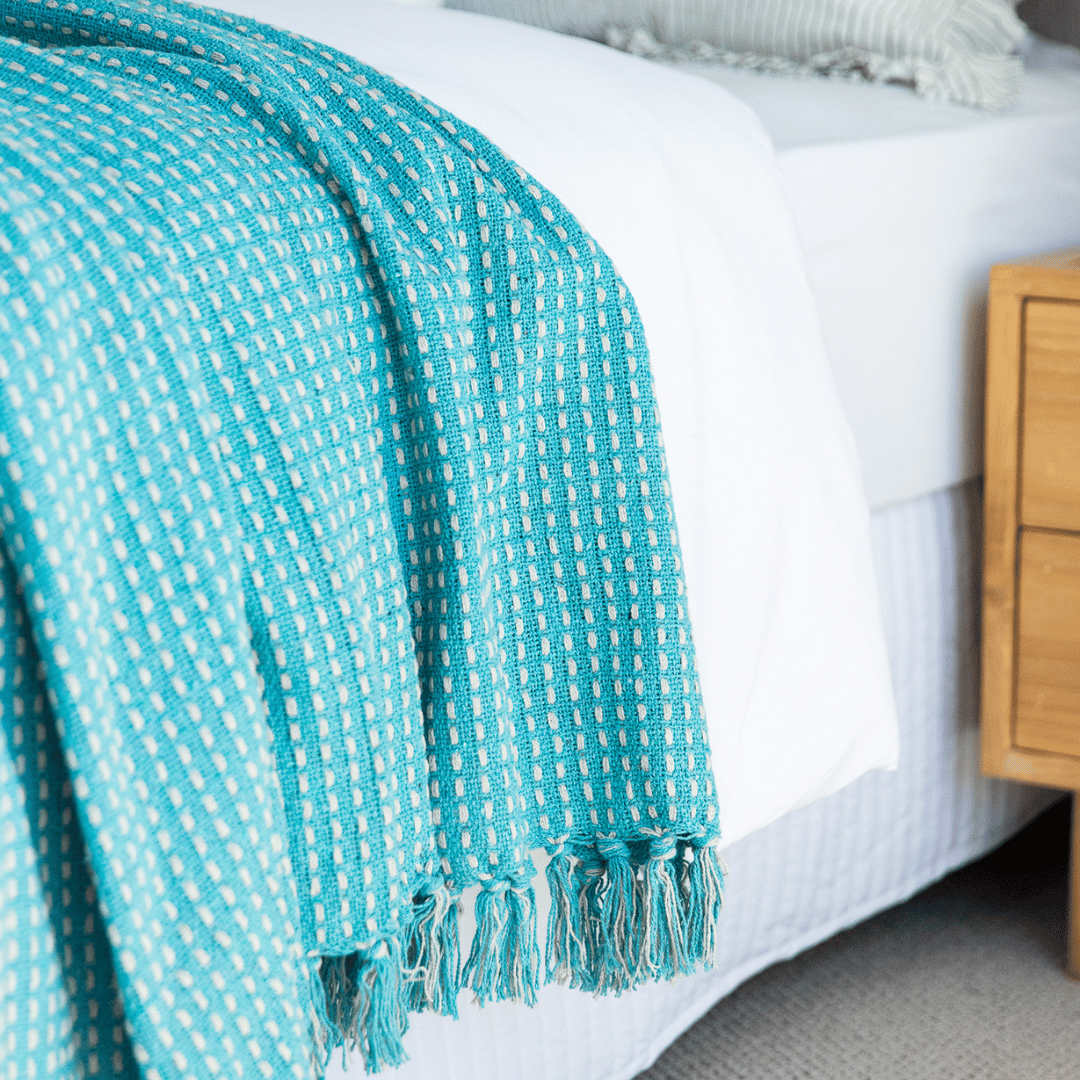The New Cosy Spring/Summer Essential, the lovely and super soft Miran Cotton Blanket in Light Blue. Perfect addition to the end of your bed for a light layer when the nights are cool, or a cosy companion on the couch.
