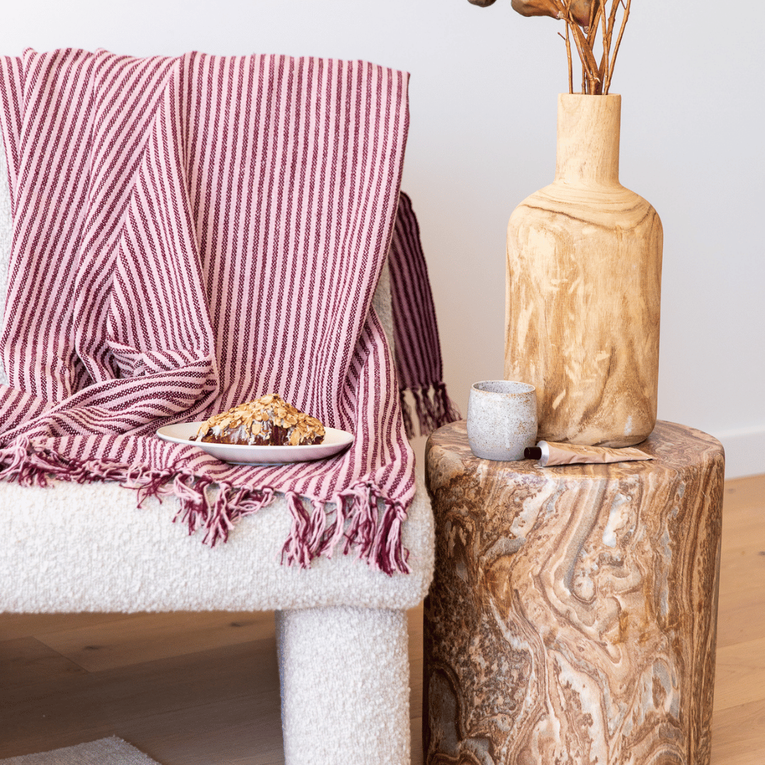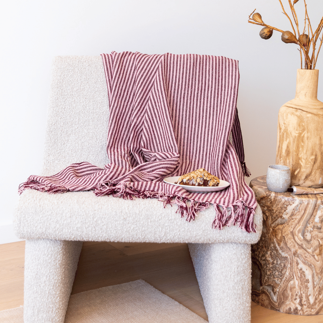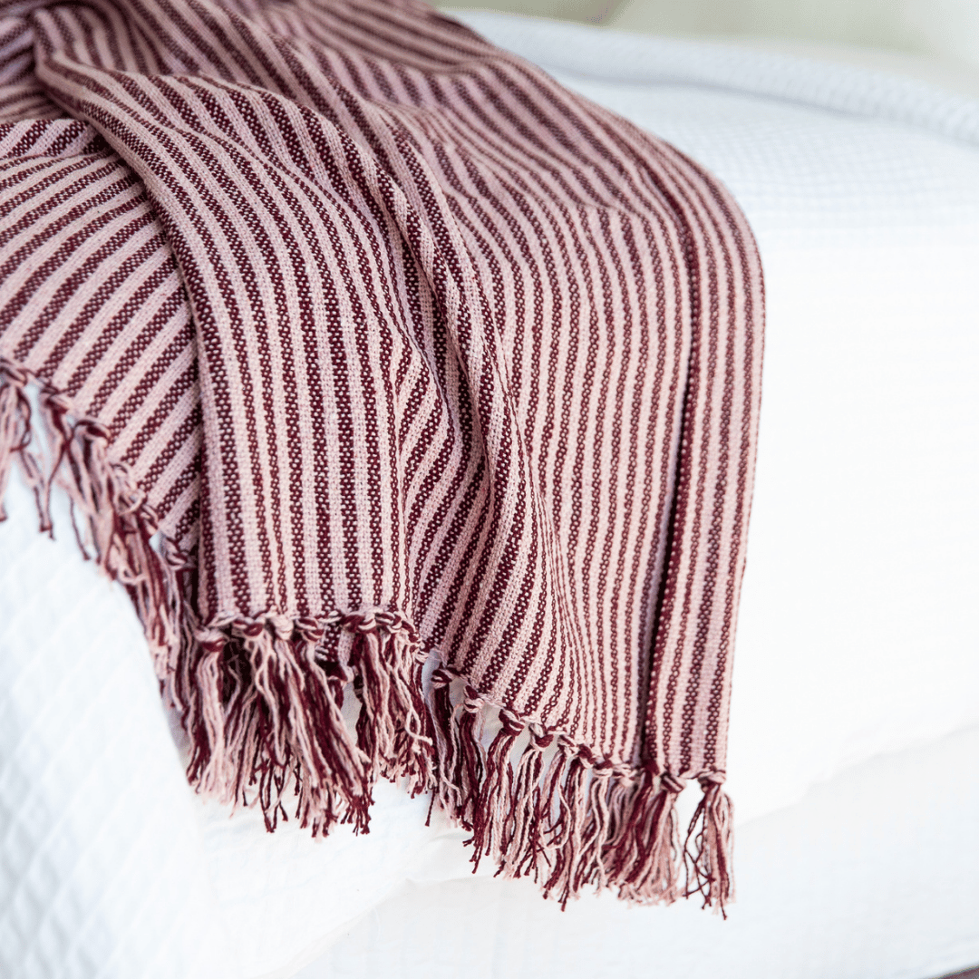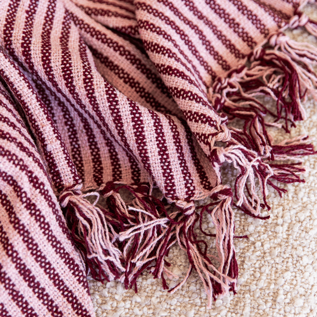 The New Cosy Spring/Summer Essential, the lovely and soft Sari Stripe Cotton Throw. Perfect addition to the end of your bed for a light layer when the nights are cool, or a cosy companion on the couch. Sourced from 100% Recycled Cotton as part of our ongoing commitment to sustainable products for Australian homes. The gorgeous Sari Stripe Cotton Throw is in Pink and Burgundy tones.