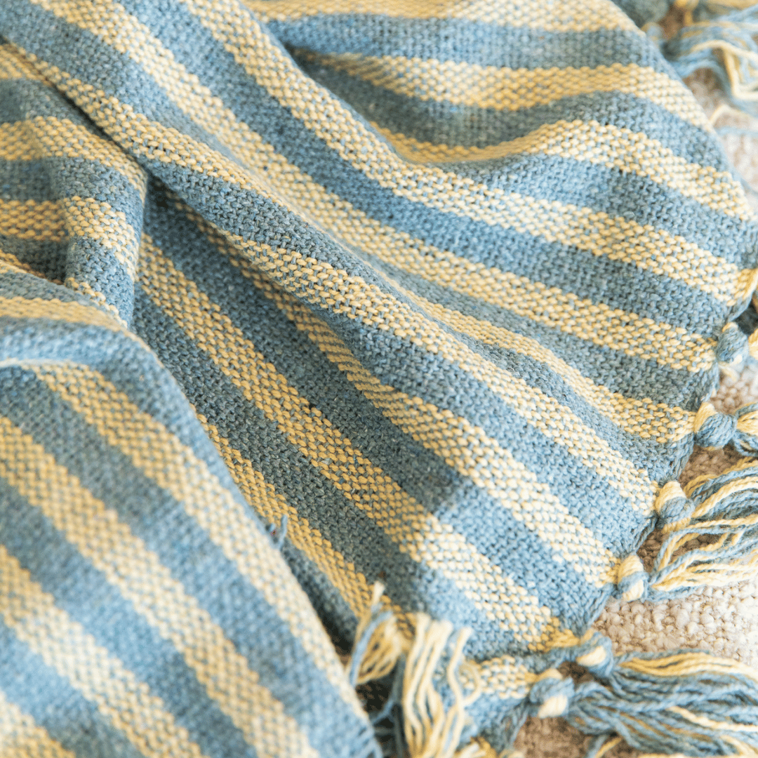 The New Cosy Spring/Summer Essential, the lovely, soft Somers Stripe Cotton Throw. Perfect addition to the end of your bed for a light layer when the nights are cool, or a cosy companion on the couch. Sourced from 100% Recycled Cotton as part of our ongoing commitment to sustainable products for Australian homes. Gorgeous Somers Stripe Cotton Throw is in a Marine Blue / Green contrasted with Soft Yellow Stripes.