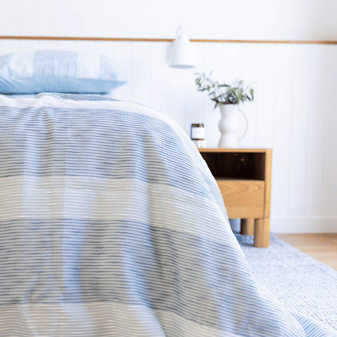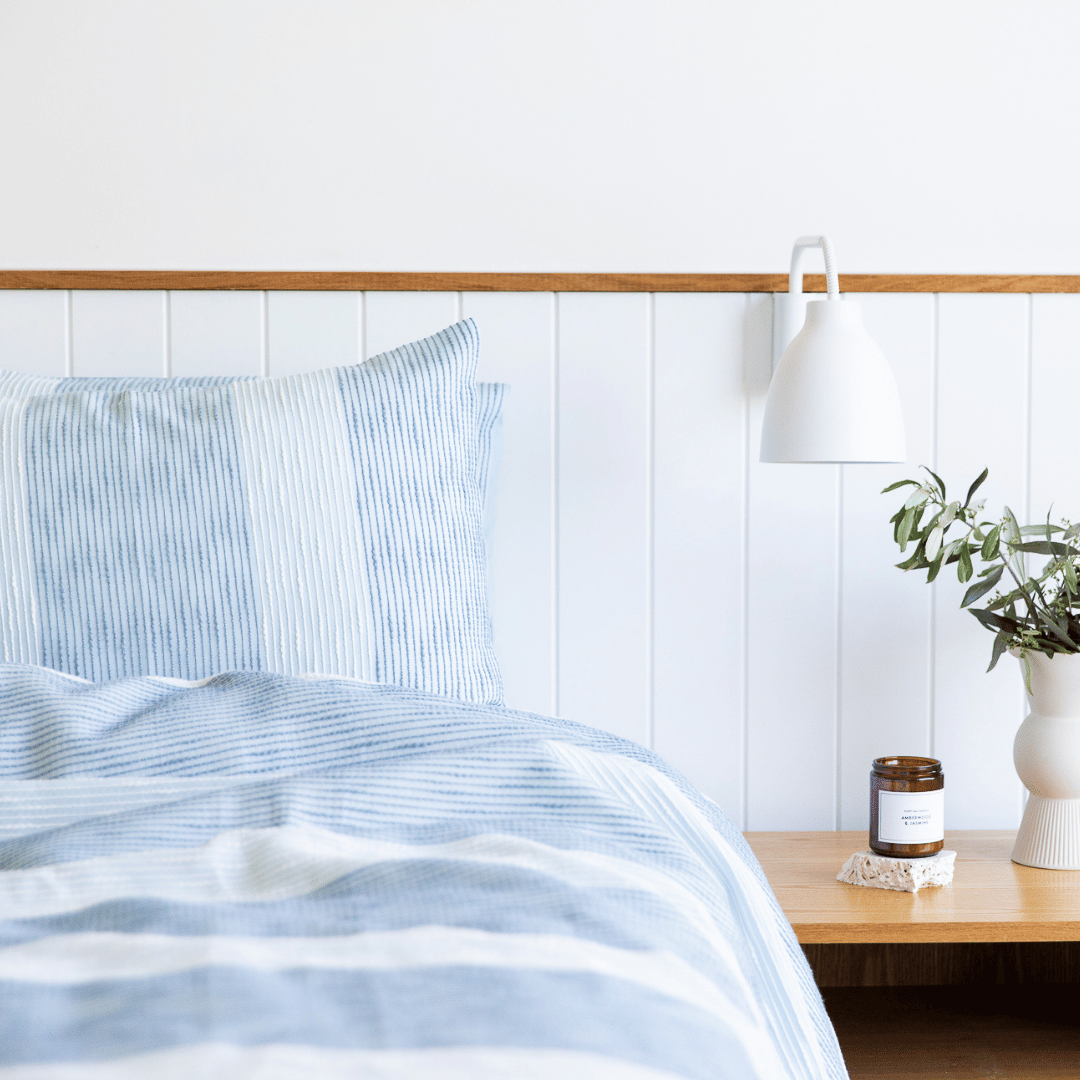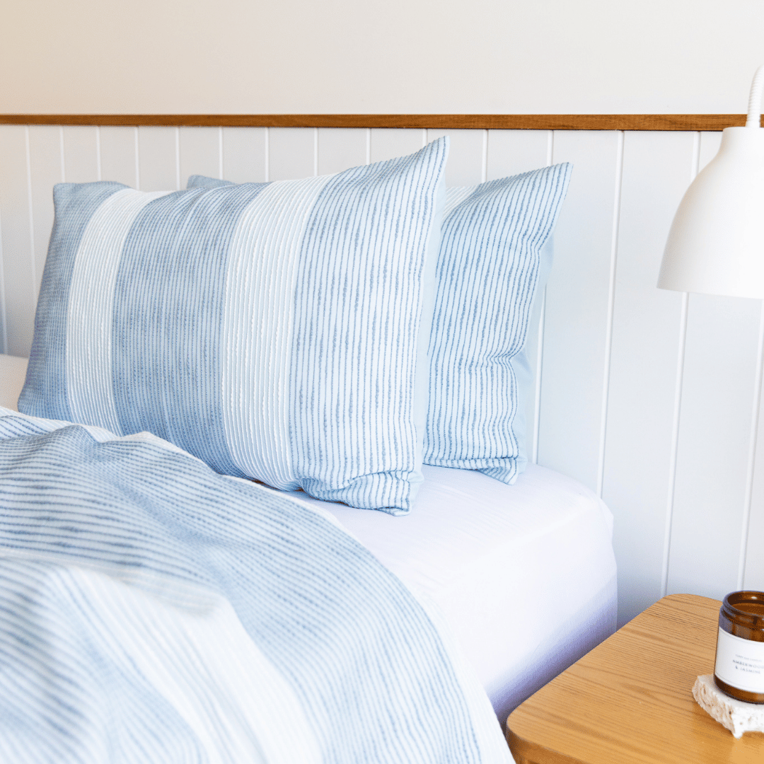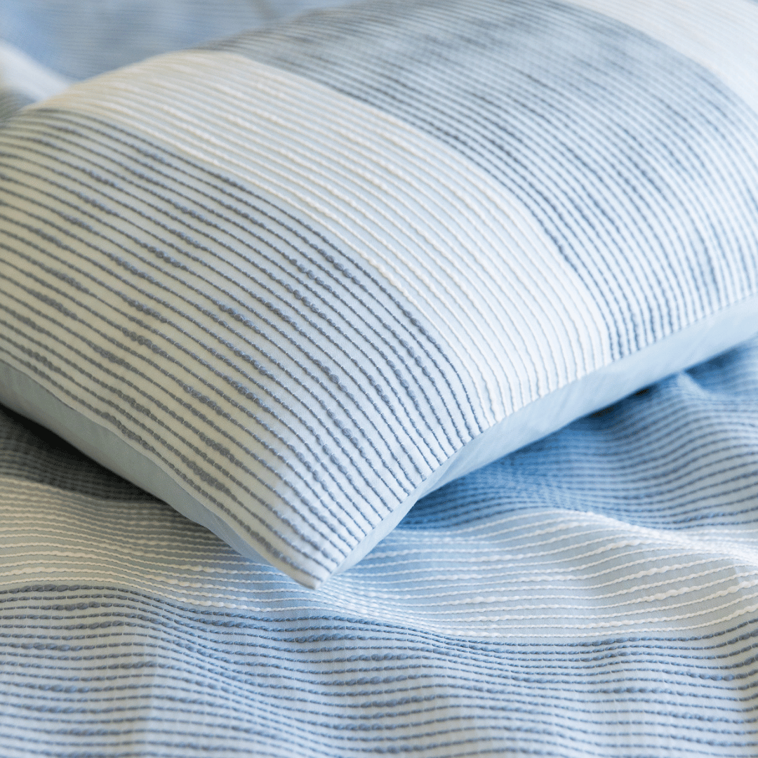 The New Season Textured Loome Quilt Cover Set is a woven Quilt Cover Set featuring soft blue tones. The Cotton Rich Textured Front is designed with a 100% Plain Cotton Backing for breathability and comfort all night long. The Loome Quilt Cover Set comes with a reusable self-fabric pouch as part of our move towards a more sustainable future. Please note, as the textured fabric is designed, the stripes of each pillowcase can vary from the photos featured below.