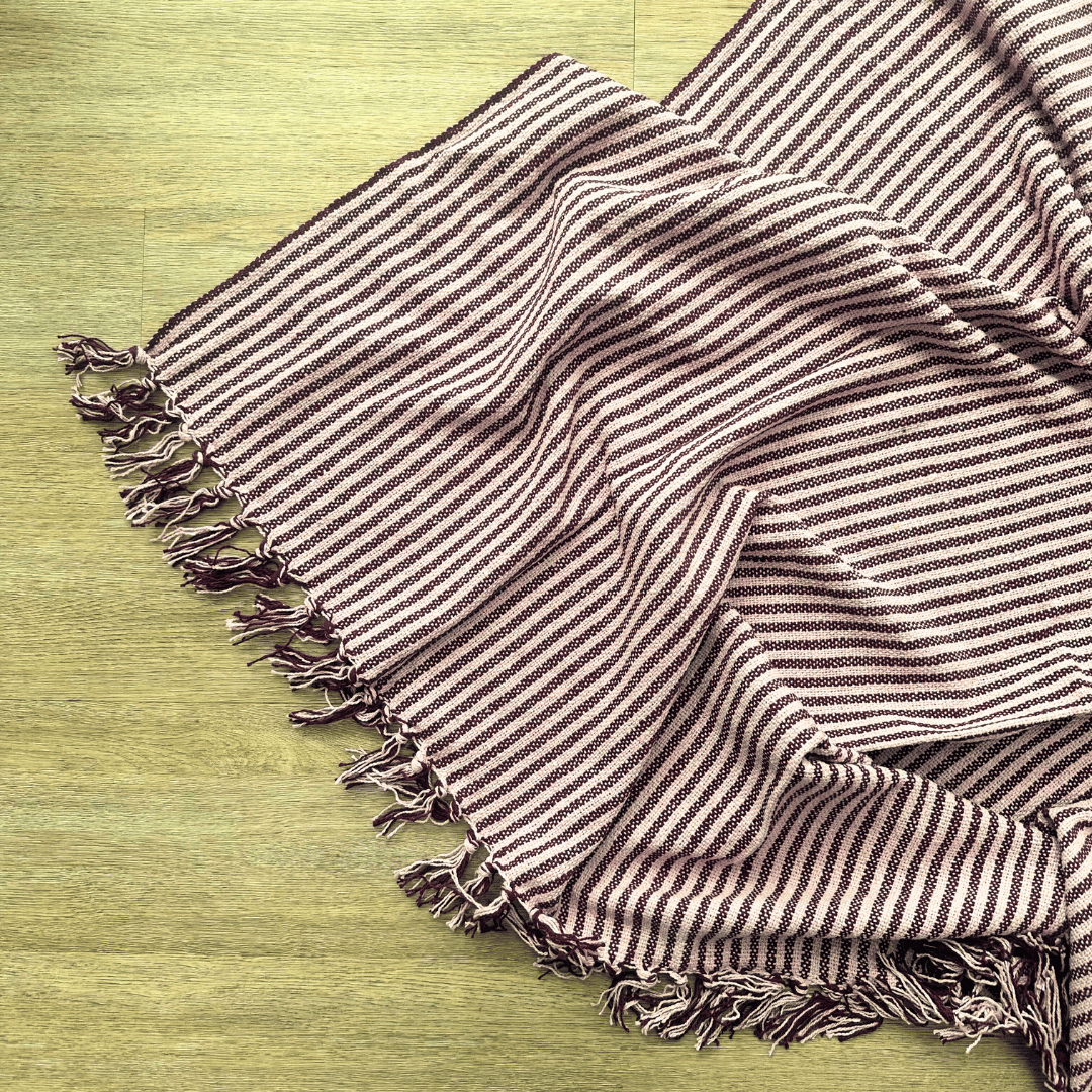 The New Cosy Spring/Summer Essential, the lovely, soft Sari Stripe Cotton Throw. Perfect addition to the end of your bed for a light layer when the nights are cool, or a cosy companion on the couch. Sourced from 100% Recycled Cotton as part of our ongoing commitment to sustainable products for Australian homes. The gorgeous Sari Stripe Cotton Throw in Pink and Burgundy tones.